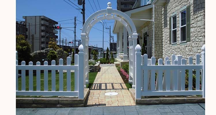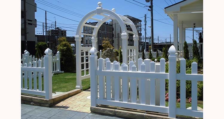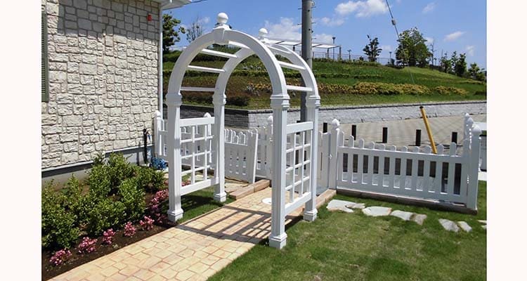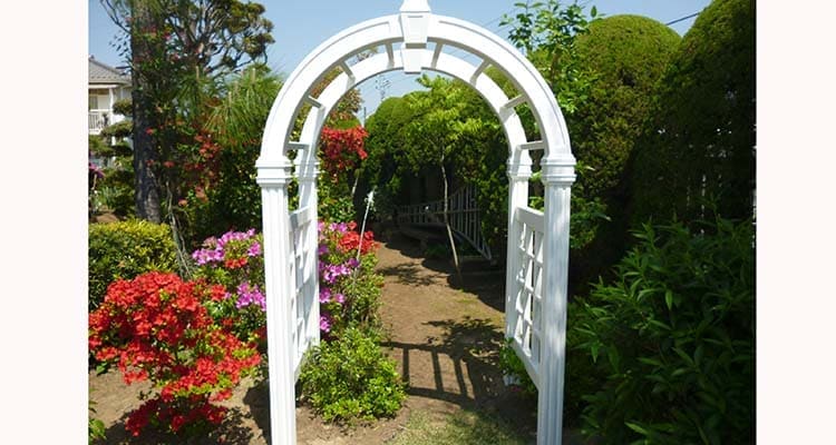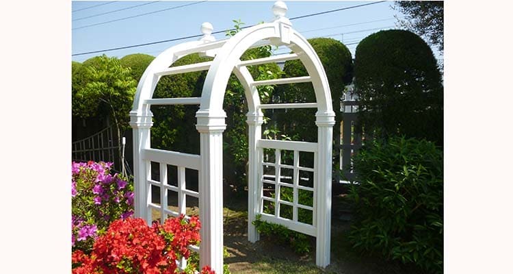 バイナル製品で作成した特別なガーデン関連用品です。白いアーチへバラやツル科の植物を誘引することでお庭をより華やかに美しく彩ります。鉄製や木製に比べ錆びたり腐ったりする心配もなく、表面温度も鉄に比べると低いため植物が夏場の暑い気温の時も長持ちします。