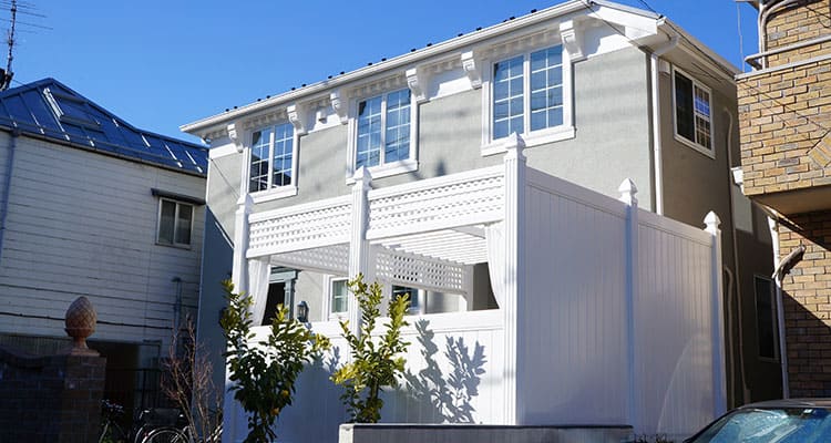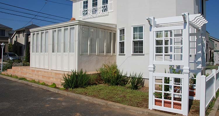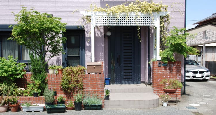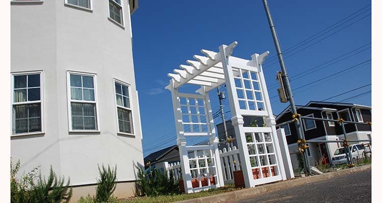 ご自宅の入り口に設置していただいたバイナル製のパーゴラです。幅を狭くご指定いただいているためアーチとしての機能も併せ持つ素敵なデザインになっています。