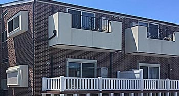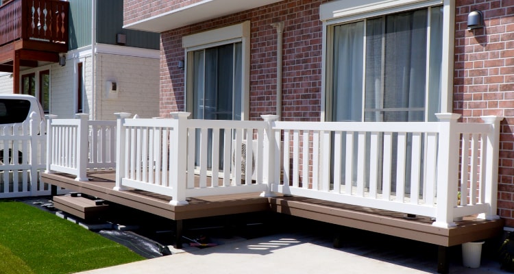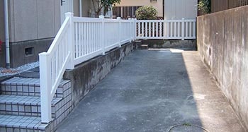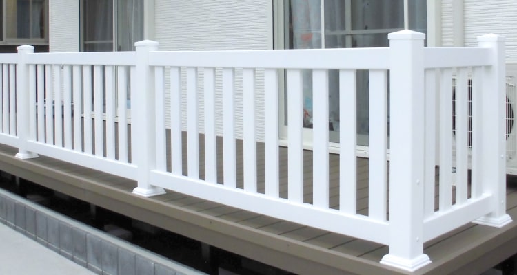 アパートのベランダとして採用いただきました。茶色い建物に白いバイナルフェンスが映えます。実は1階のベランダすべてがバイナルで作成されています。金属製の製品とは違い実際の使用感も踏んだ時に柔らかい踏み心地になるため入居者の方にも好評です。