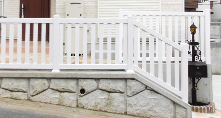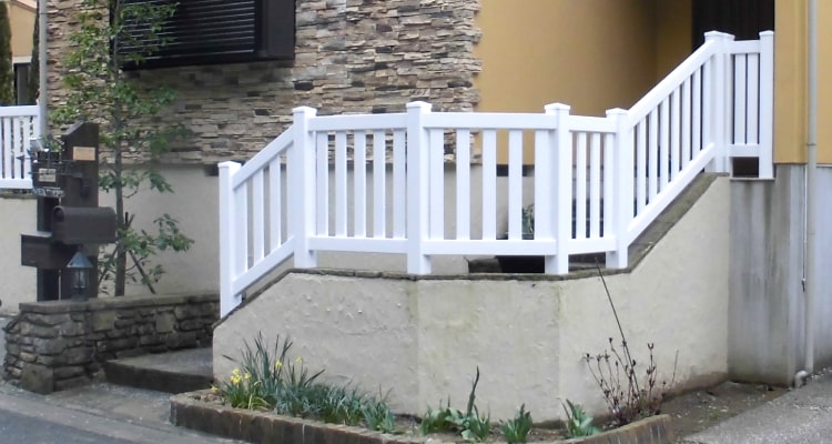 横に一直線に並べると通常のフェンスですが、階段に対して流すことで手すりとしての役割も担います。上部が閉じたデザインのワイドクローズドピケットフェンスだからこそ実現できました。フェンスとしての役割だけではなく、手すりとしてのご注文も承ります。